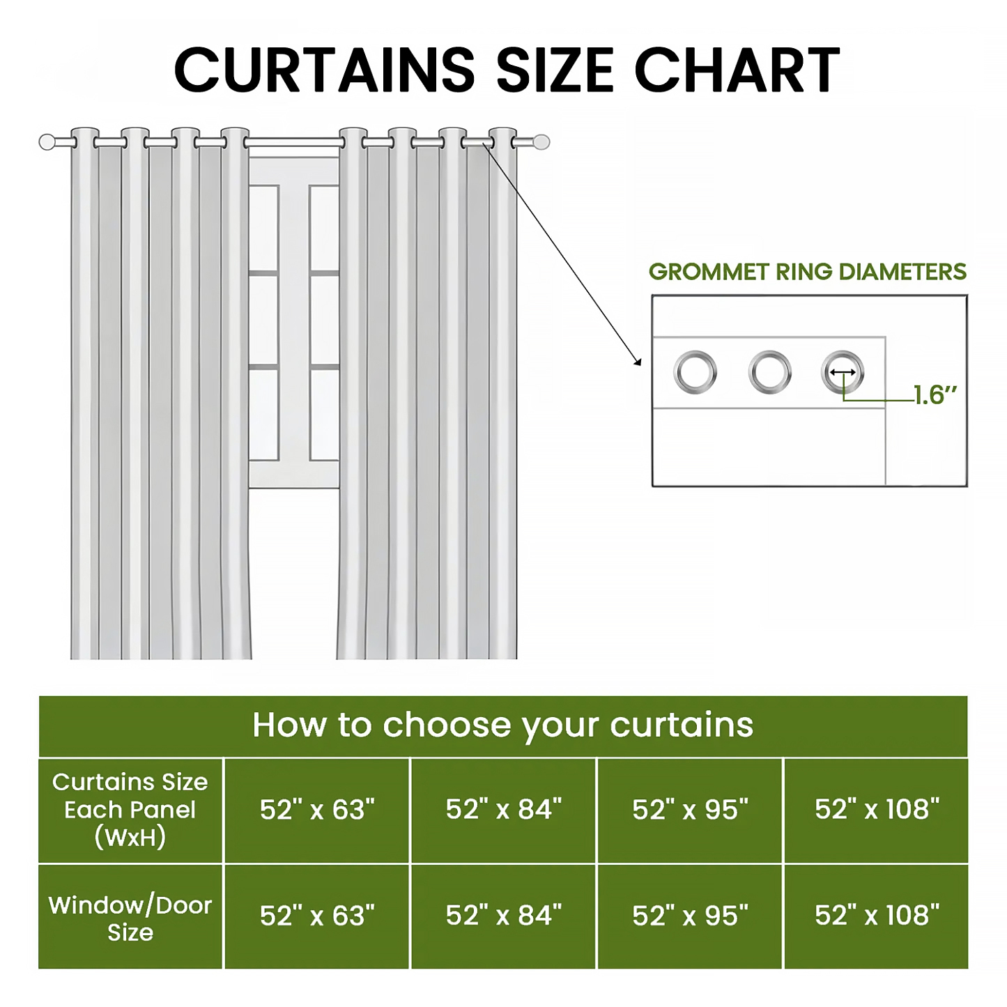 Accessories: 1.6-inch metal grommets (fits most standard curtain rods, for easy, hassle-free hanging and sliding).